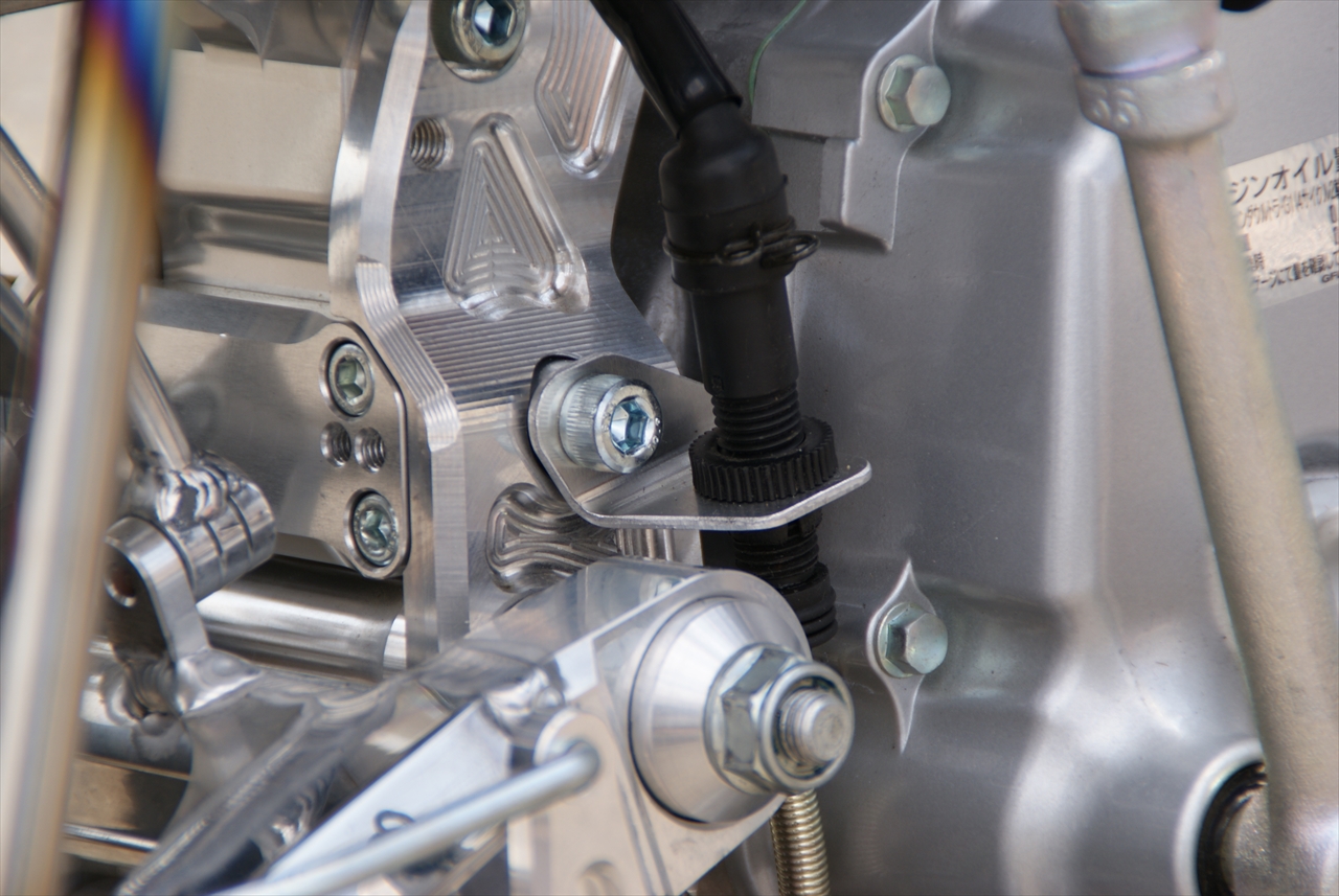 ●エンジンマウントやスイングアームピポットプレートは、全てネジ部分にノックピン加工を施し、せん断方向の荷重をボルトで受けない構造です。