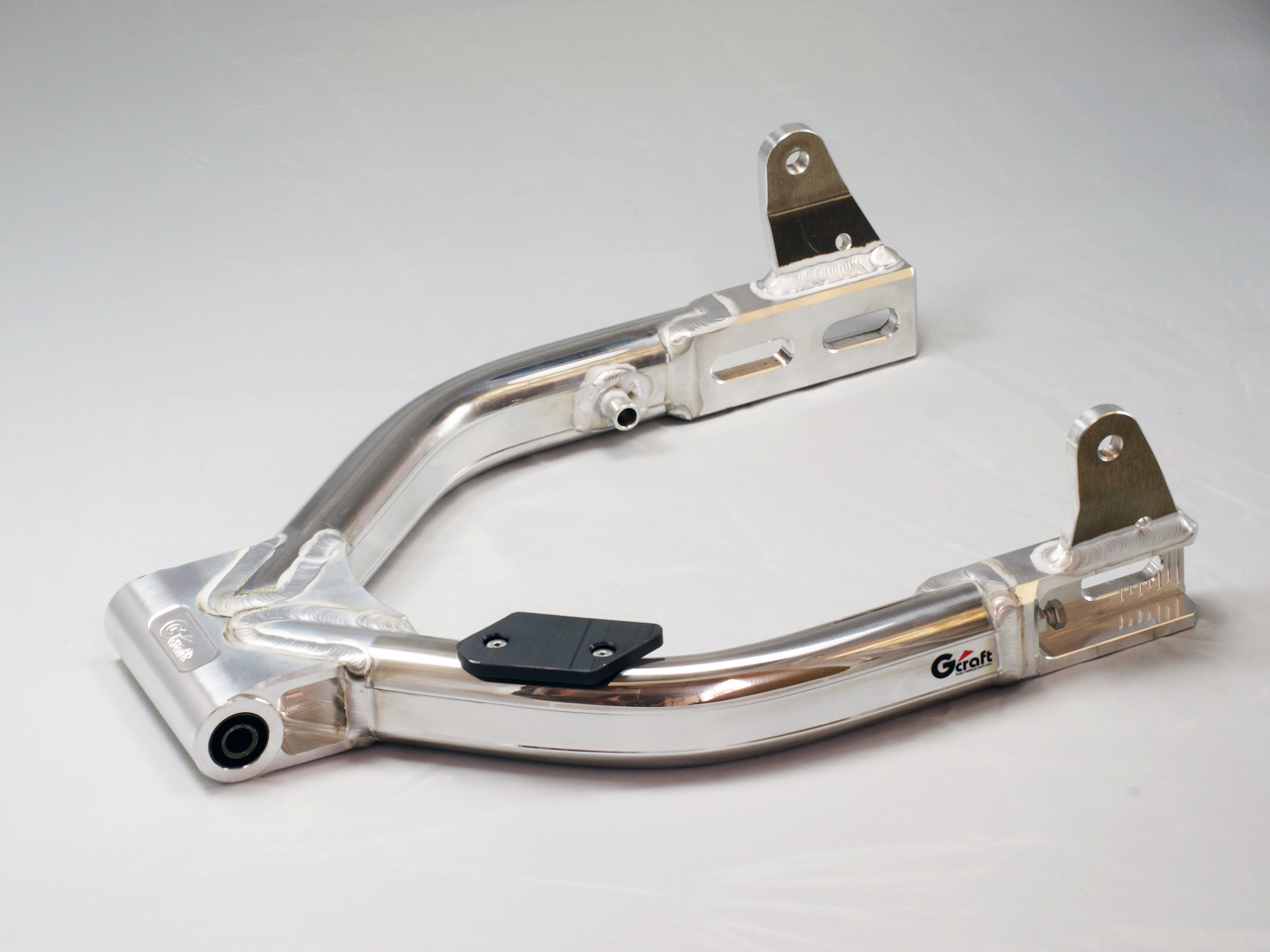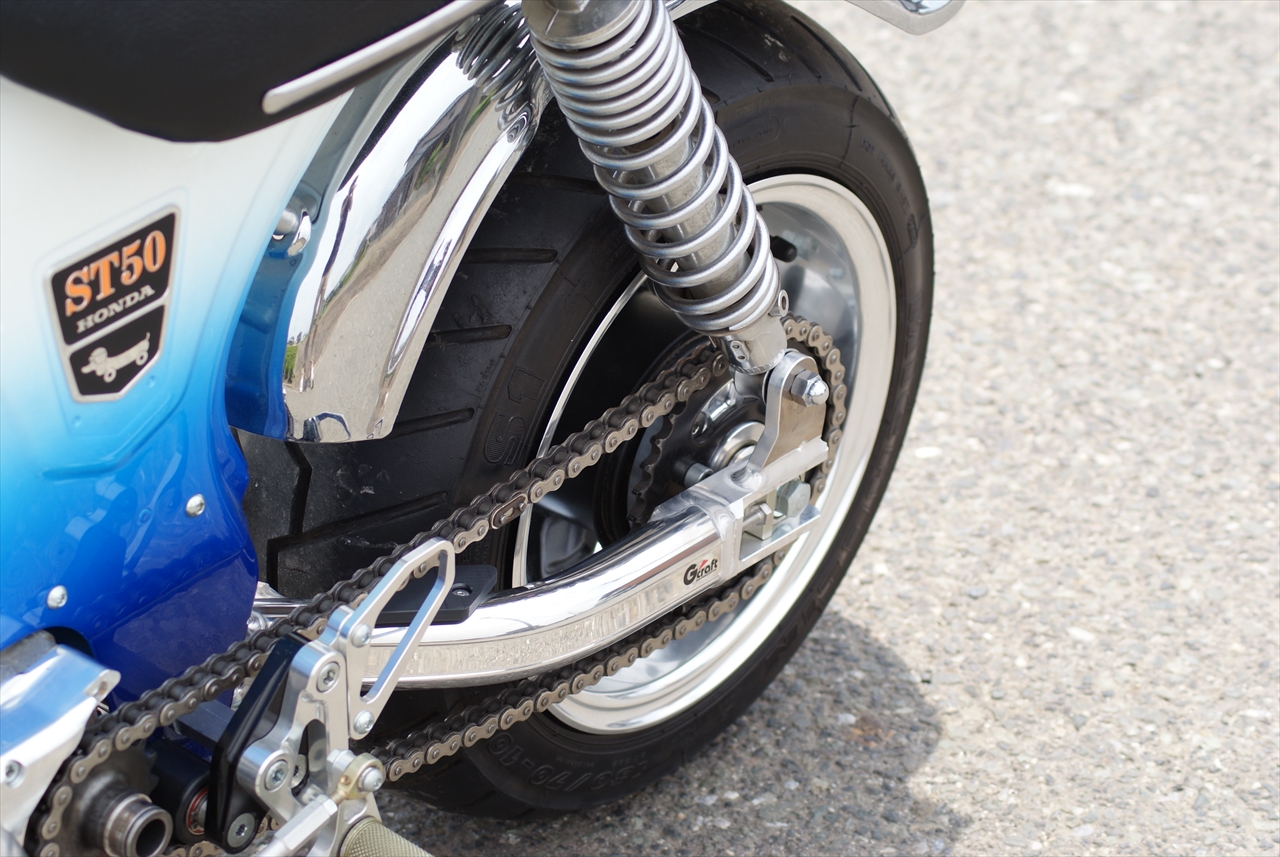 10インチ5.5Jワイドホイールを装着できるように、純正幅(167mm)よりも40mm広い、スイングアーム内幅207mm。。